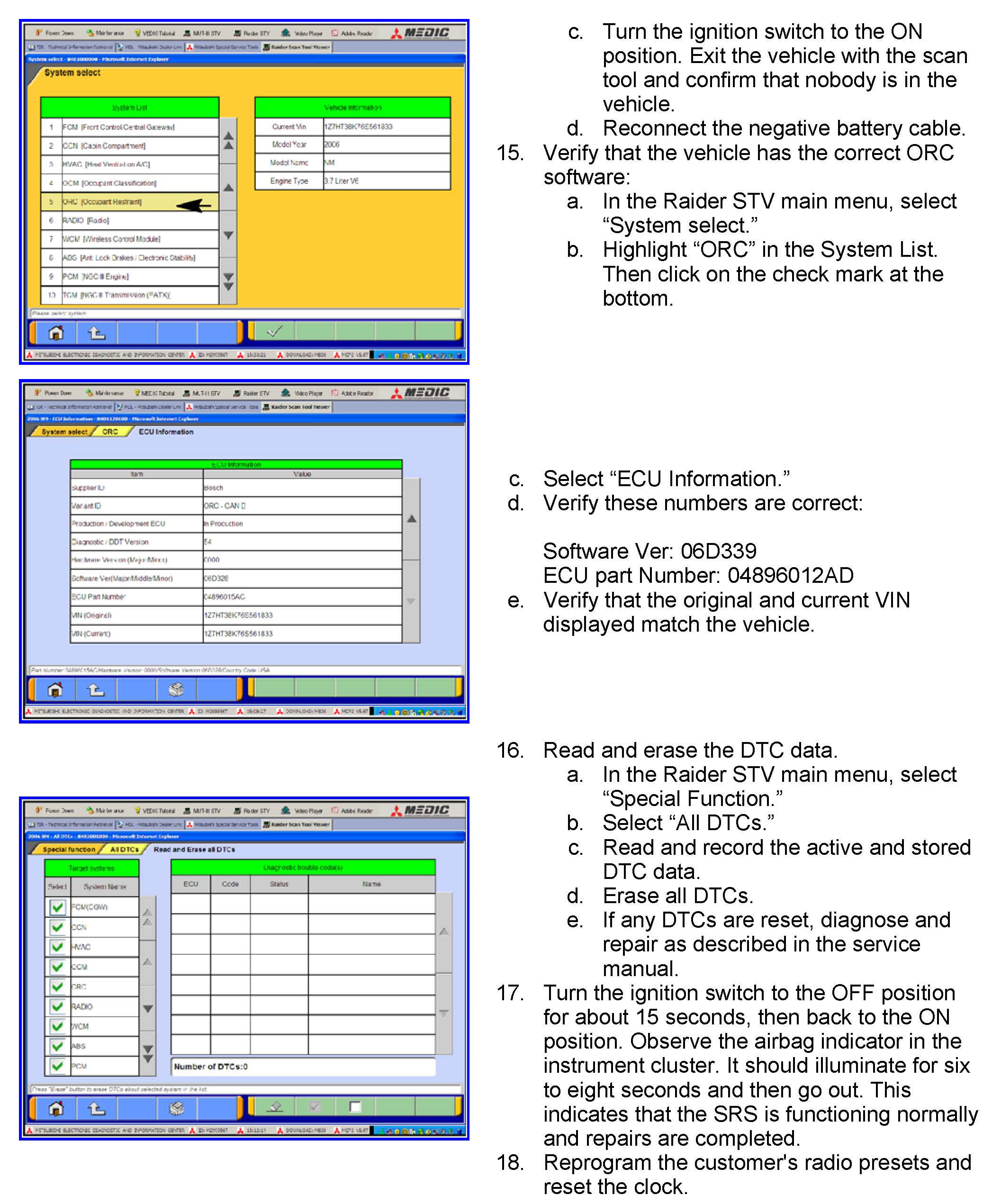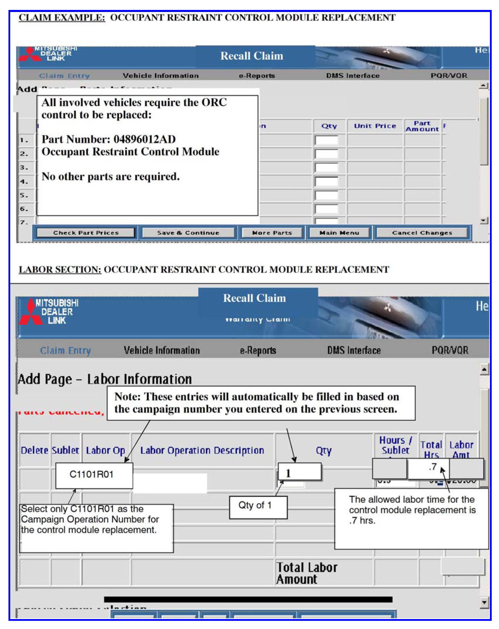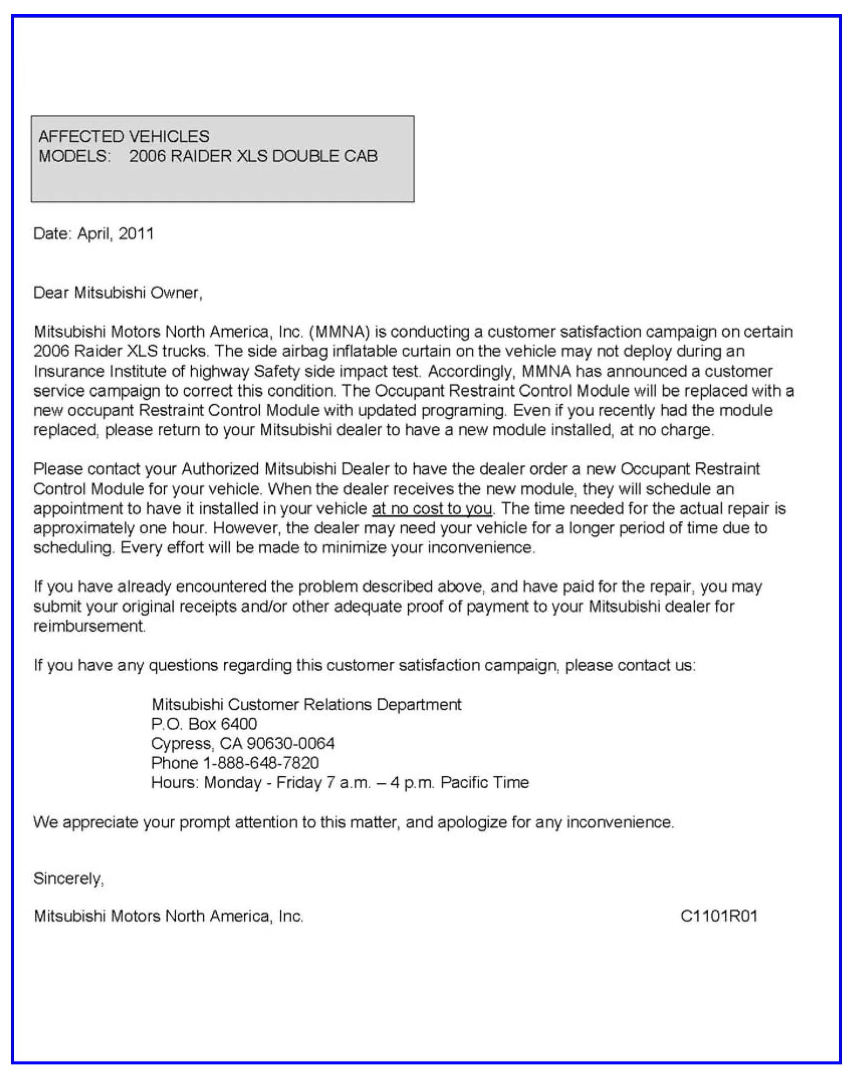 A letter will be sent to all owners of affected vehicles requesting them to bring their vehicle to their Mitsubishi Motors dealer to have the ORC module replaced. A copy of the customer notification letter appears at the end of this bulletin.