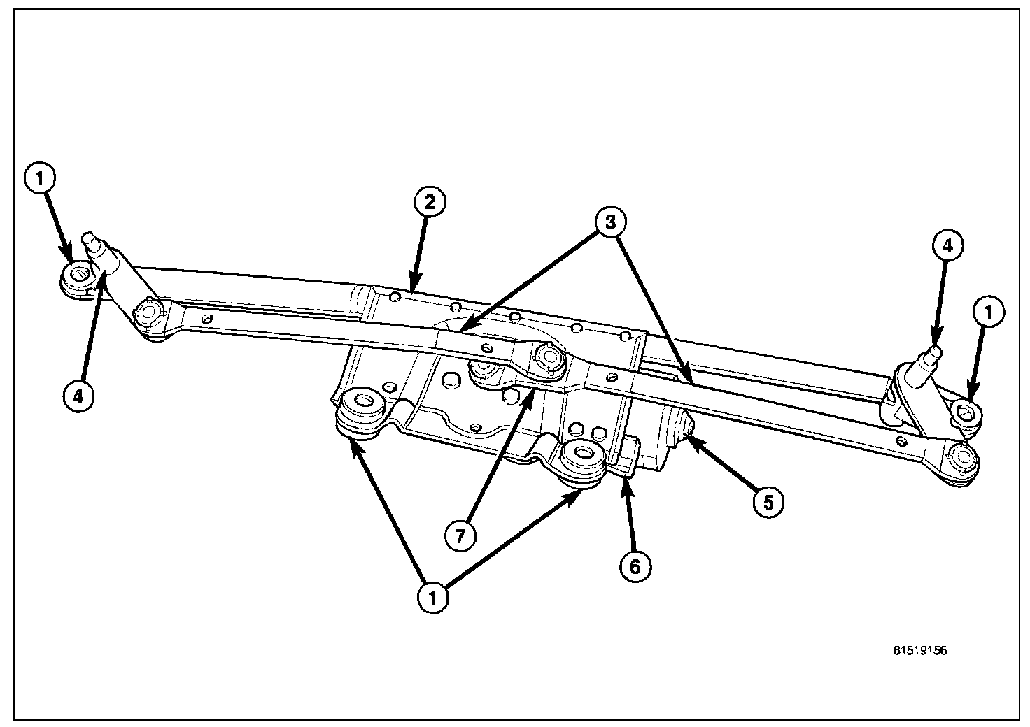The wiper module is secured with screws through four rubber grommet-type insulators (1) to the cowl plenum panel. The module is concealed beneath the molded plastic cowl plenum cover/grille panel between the base of the windshield and the rear edge of the hood panel. The ends of the pivot shafts protruding through openings in the cowl plenum cover/grille panel to drive the wiper arms and blades are the only visible components of the wiper module. The wiper module consists of the following major components: