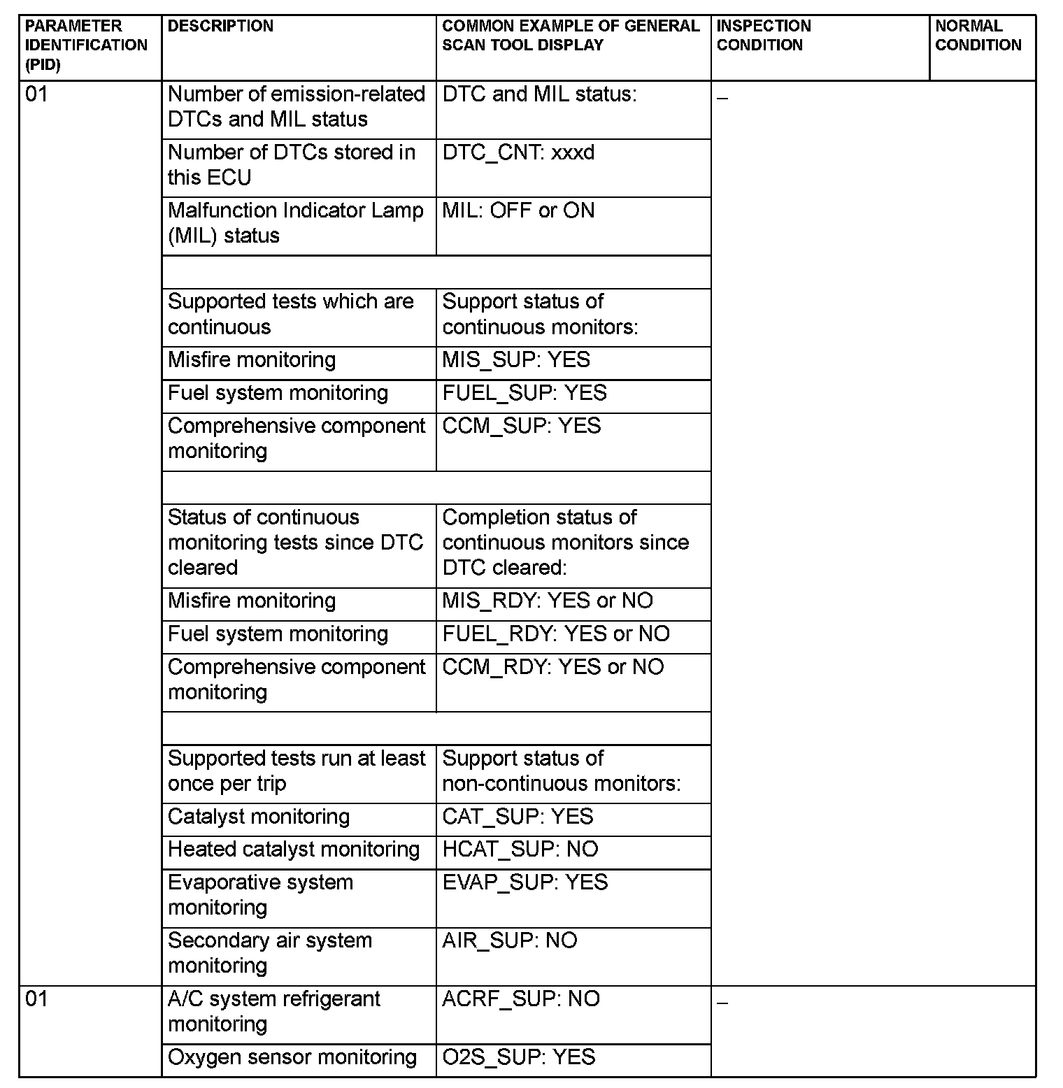 GENERAL SCAN TOOL (GST) MODE 01 REFERENCE TABLEThe purpose of this service of to allow access to current emission-related data values, including analogue inputs and outputs, digital inputs and outputs, and system status information.