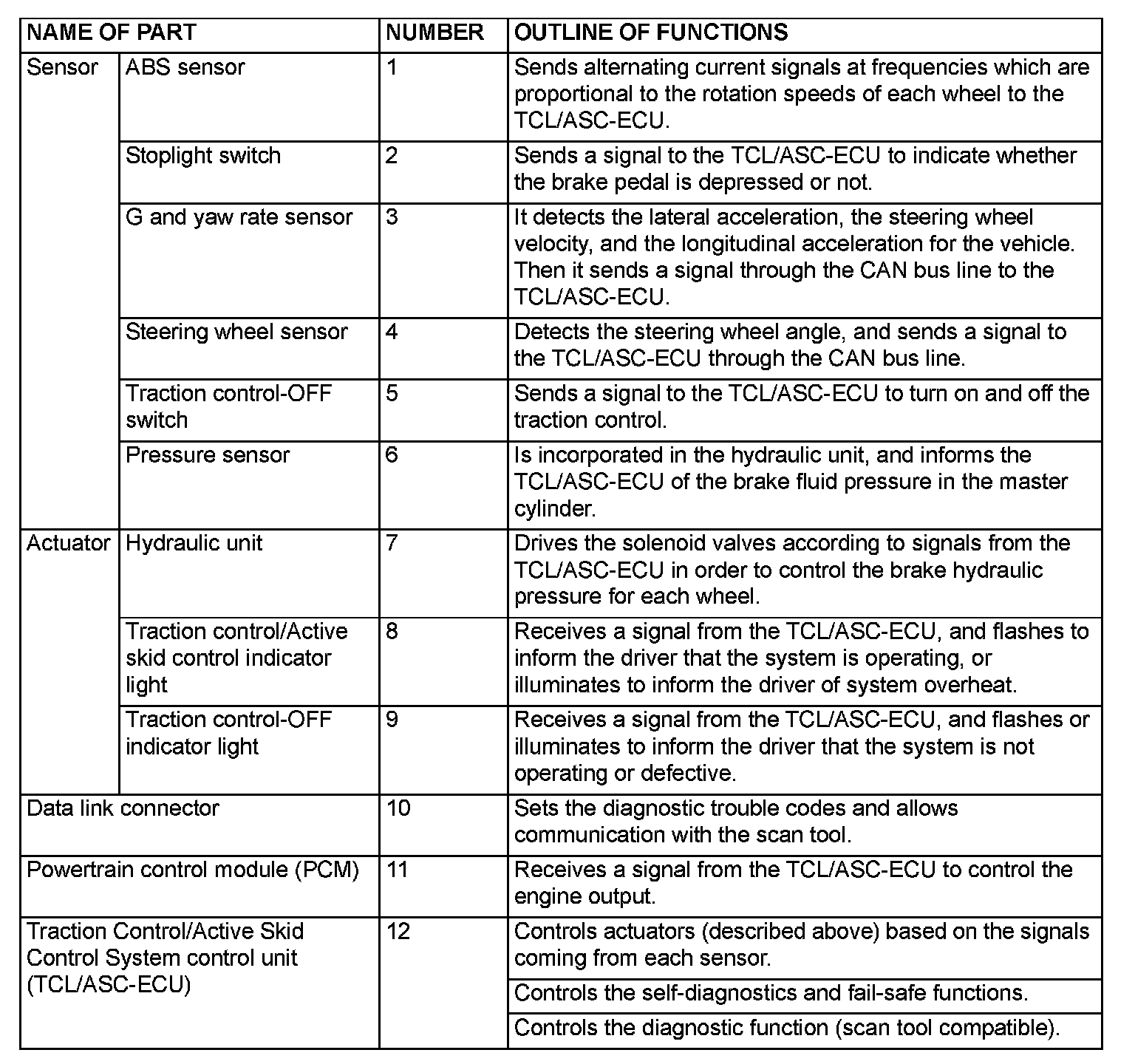 The Traction Control and Active Skid Control (TCL/ASC) System is a system that adds a yaw rate sensor, a steering wheel sensor and master cylinder pressure sensor (incorporated in hydraulic unit) to the ABS system.