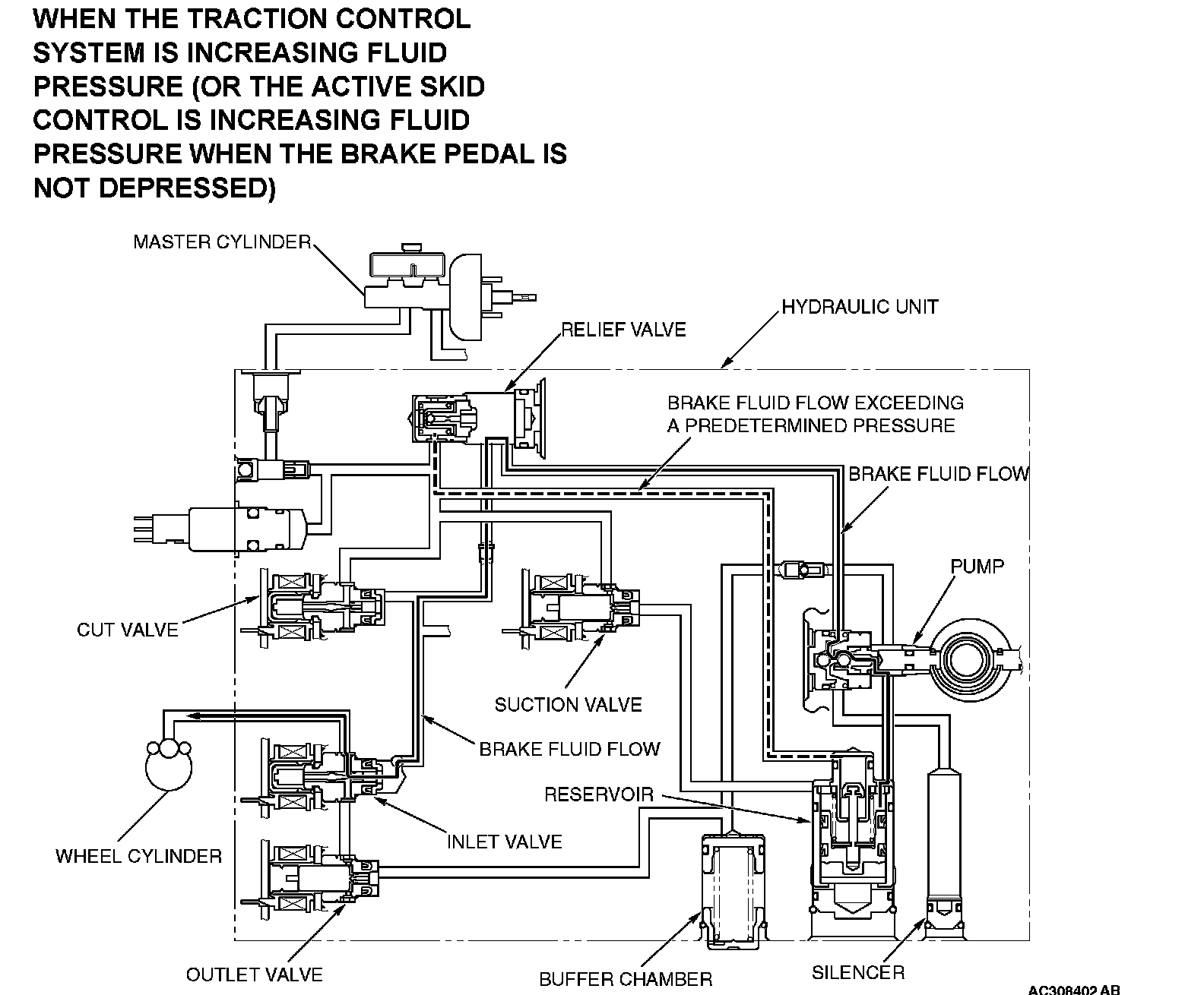 WHEN THE TRACTION CONTROL SYSTEM IS INCREASING FLUID PRESSURE (OR THE ACTIVE SKID CONTROL IS INCREASING FLUID PRESSURE WHEN THE BRAKE PEDAL IS NOT DEPRESSED)