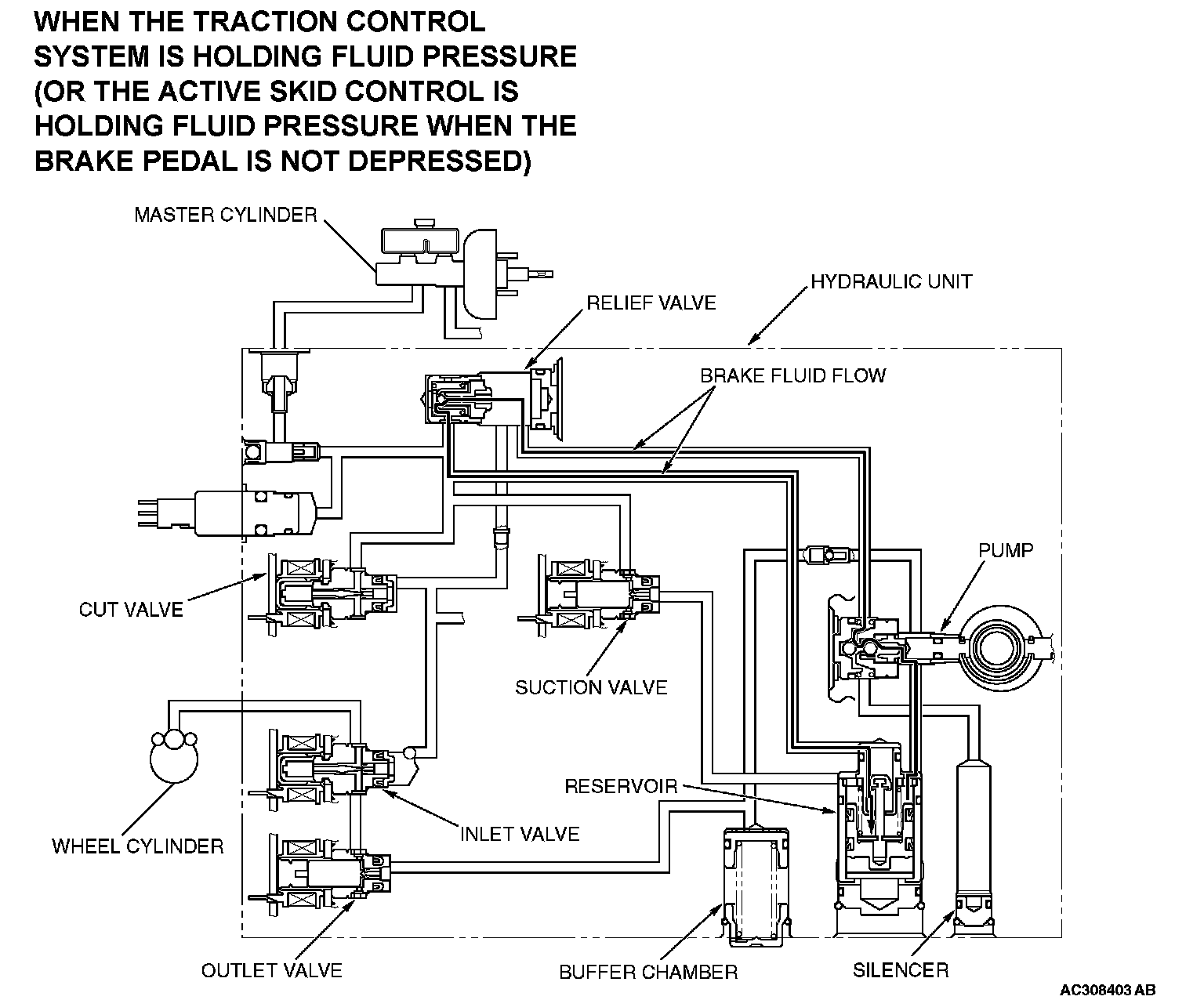 WHEN THE TRACTION CONTROL SYSTEM IS HOLDING FLUID PRESSURE (OR THE ACTIVE SKID CONTROL IS HOLDING FLUID PRESSURE WHEN THE BRAKE PEDAL IS NOT DEPRESSED):