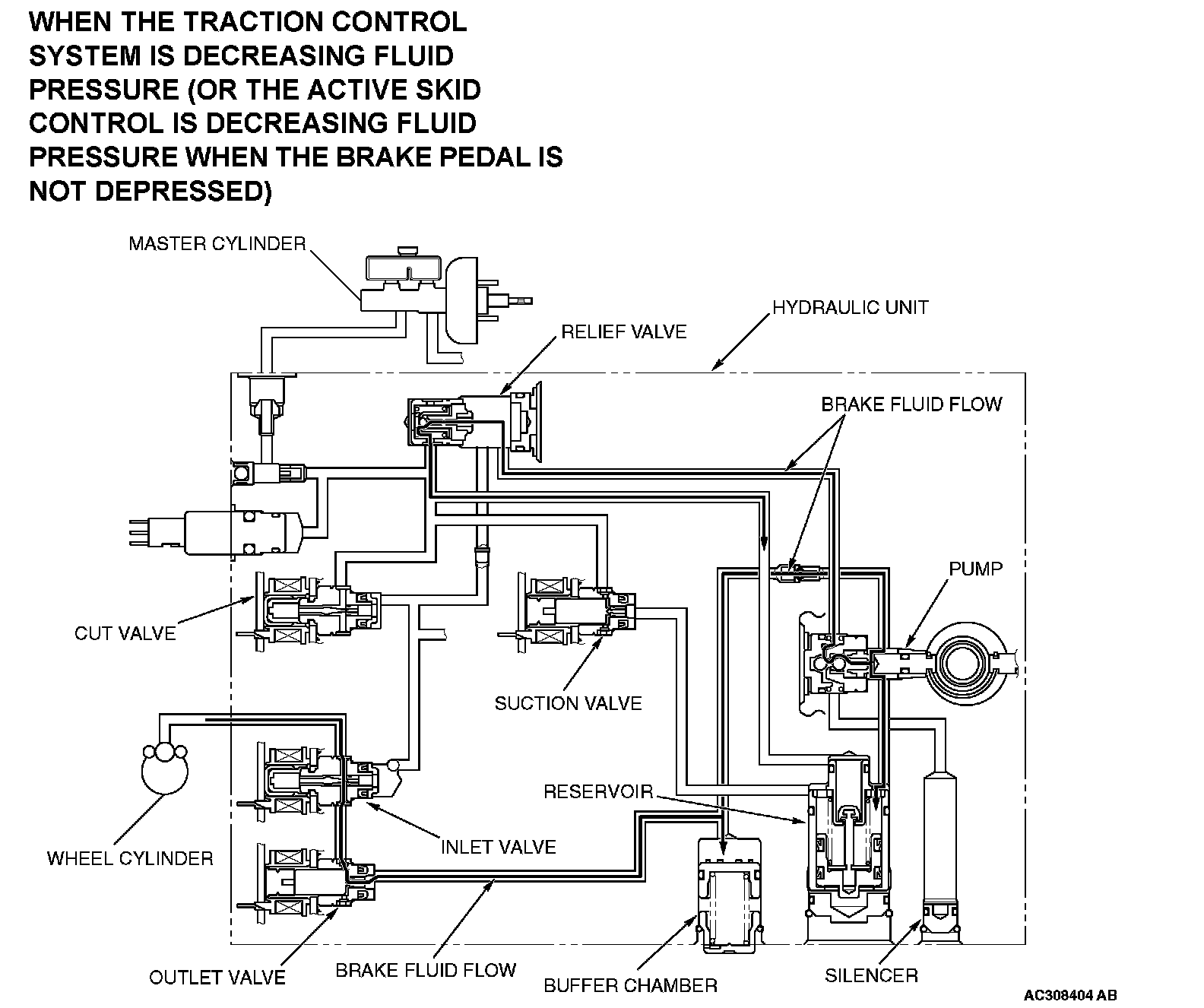 WHEN THE ACTIVE SKID CONTROL IS DECREASING THE FLUID PRESSURE WHILE THE BRAKE PEDAL IS DEPRESSED
