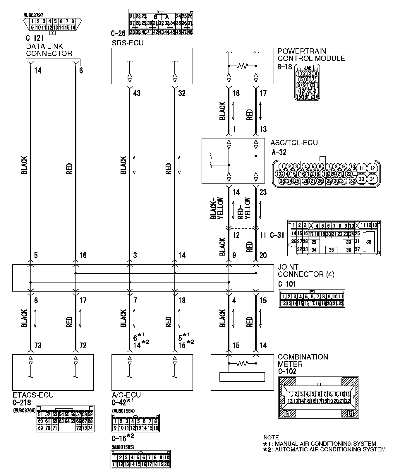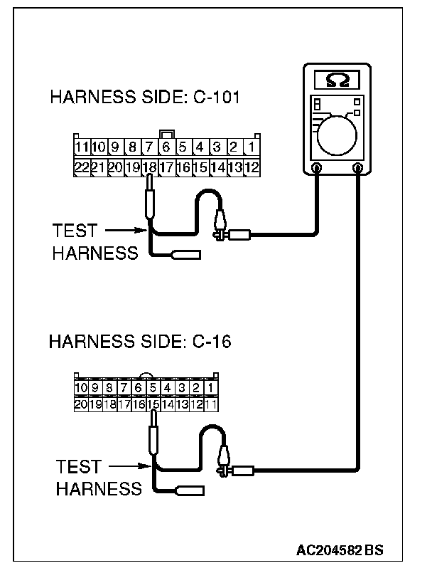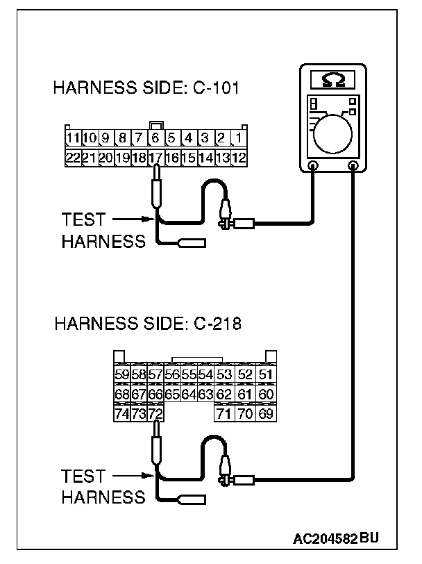 1. Disconnect joint connector (4) C-101 and ETACS-ECU connector C-218, and measure the resistances at the wiring harness sides of joint connector (4) C-101 and ETACS-ECU connector C-218.