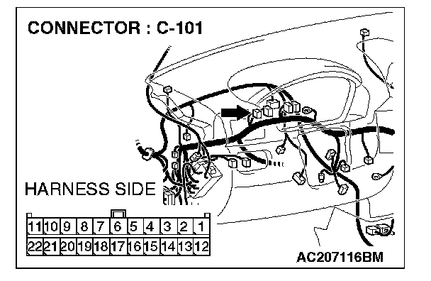 STEP 5. Check joint connector (4) C-101 and combination meter connector C-102 for loose, corroded or damaged terminals, or terminals pushed back in the connector.