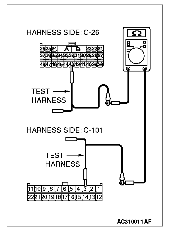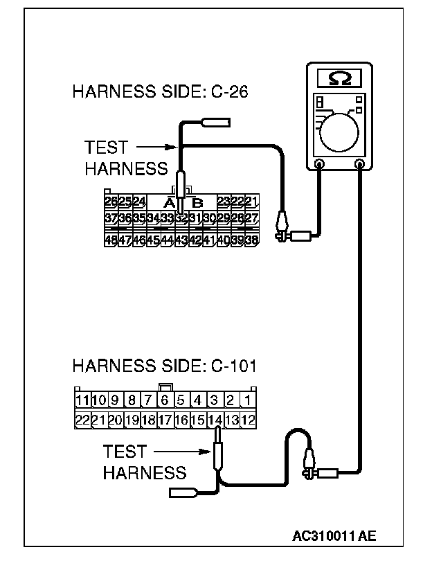 1. Disconnect joint connector (4) C-101 and SRS-ECU connector C-26, and measure the resistances at the wiring harness sides of joint connector (4) C-101 and SRS-ECU connector C-26.