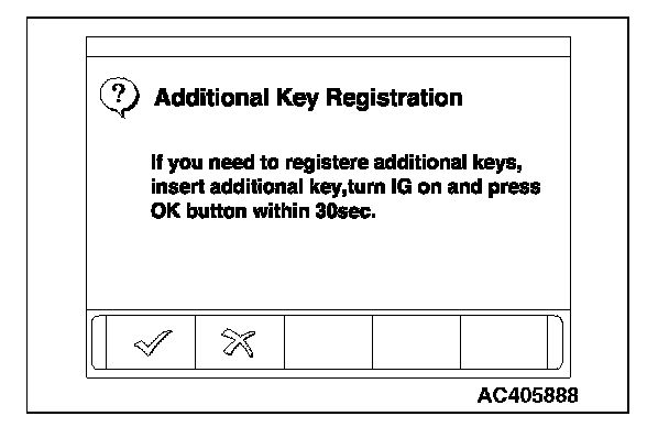 9. When the ignition key registration is finished, the additional key registration menu is displayed. To register the additional key, insert the key and turn the ignition switch to the "ON" position. Then, press the OK button. Press the CANCEL button to terminate the ignition key registration.