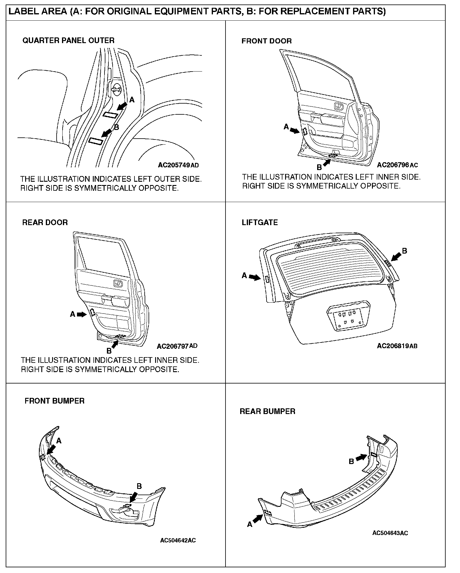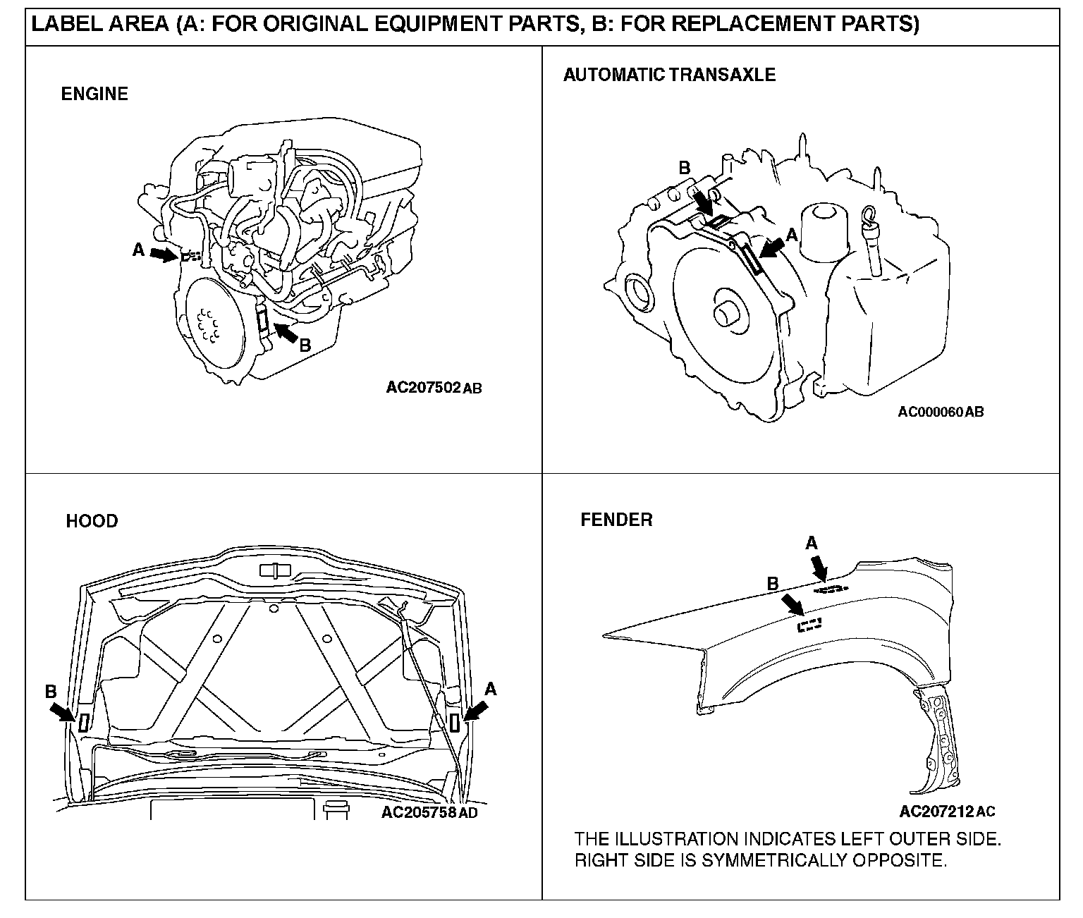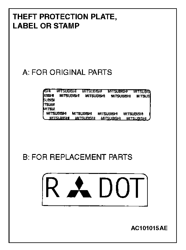 CAUTION: When replacing a part that has the theft protection plate, label or stamp on it, be sure that the part has either A or B shown in the figure. It is illegal if both A and B are attached, or neither A nor B is attached.