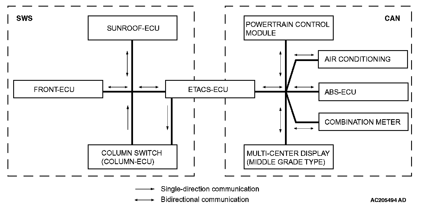 As shown in the figure, SWS communications connect the ETACS*1-ECU, the column switch (in the column-ECU), the front-ECU, and the sunroof-ECU. CAN*2*3 communications connect the ETACS-ECU, the powertrain control module, the A/C-ECU, the combination meter, the ABS-ECU, and the middle-grade multi-center display. These two communications groups are connected to form a dedicated network for sending multiplex data.