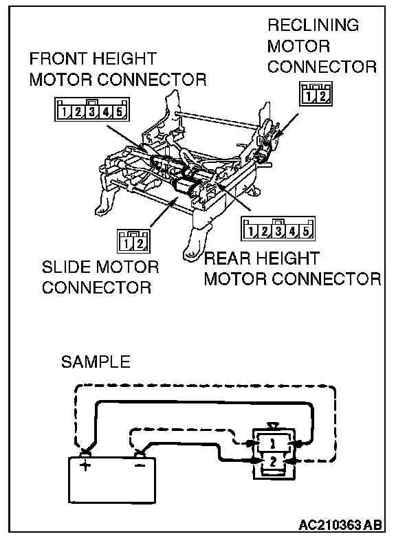 2. Connect the battery power supply to the terminal 2 and ground the terminal 1 for the front reclining side, rear slide side.