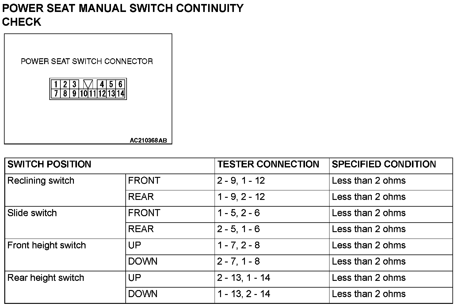POWER SEAT MANUAL SWITCH CONTINUITY CHECK