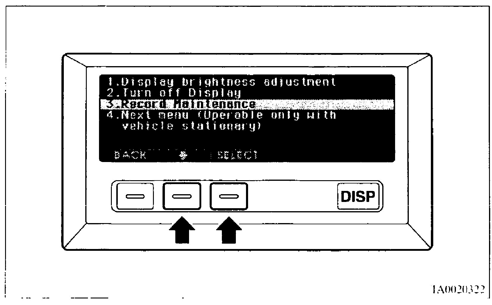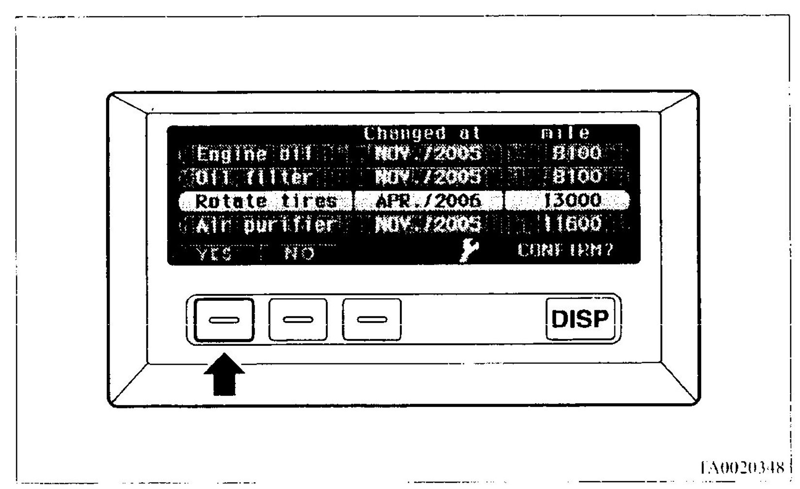 4. Press the "YES" function button to confirm the maintenance date and distance until next scheduled maintenance that were set in step 3. If you press the "NO" function button, the monitor will return to the display in step 2 of this procedure.