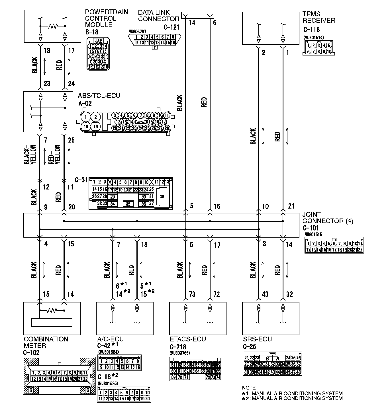 1. Disconnect joint connector (4) C-101 and ETACS-ECU connector C-218, and measure the voltage at the wiring harness side of joint connector (4) C-101.