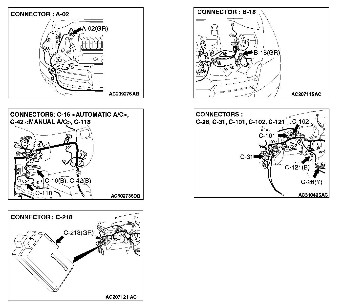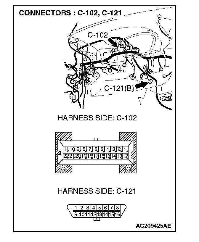 STEP 1. Check powertrain control module connector B-18, combination meter connector C-102 and data link connector C-121 for loose, corroded or damaged terminals, or terminals pushed back in the connector.