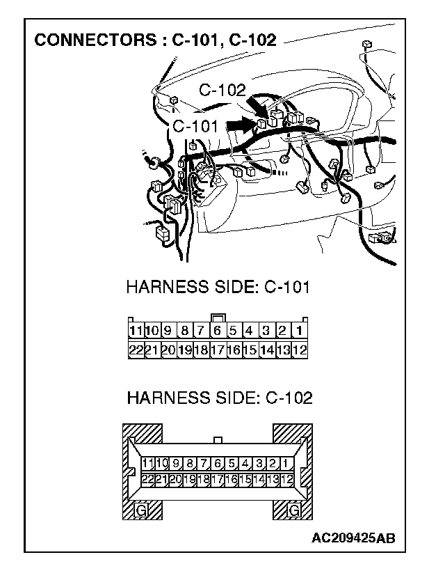 1. Disconnect joint connector (4) C-101 and combination meter connector C-102, and measure the voltage at the wiring harness side of joint connector (4) C-101.