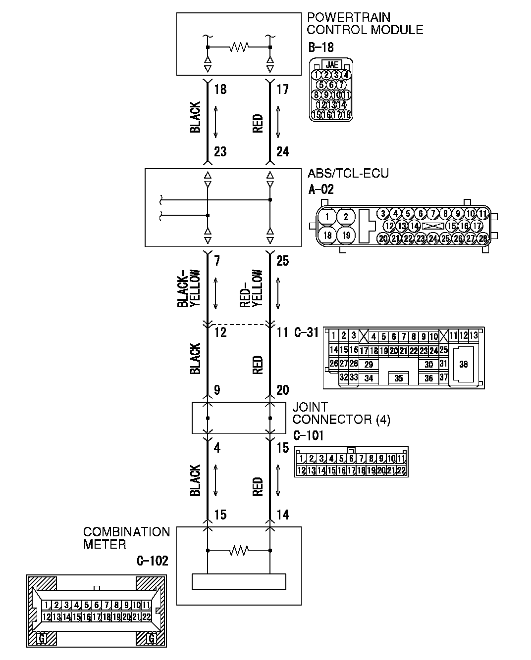 1. Disconnect ABS/TCL-ECU connector A-02 and powertrain control module connector B-18, and measure the resistance between each wiring harness side connector.
