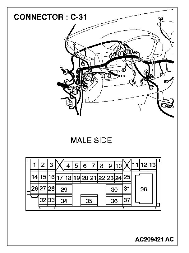 STEP 1. Check intermediate connector C-31 for loose, corroded or damaged terminals, or terminals pushed back in the connector.