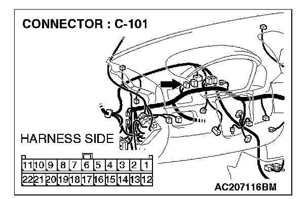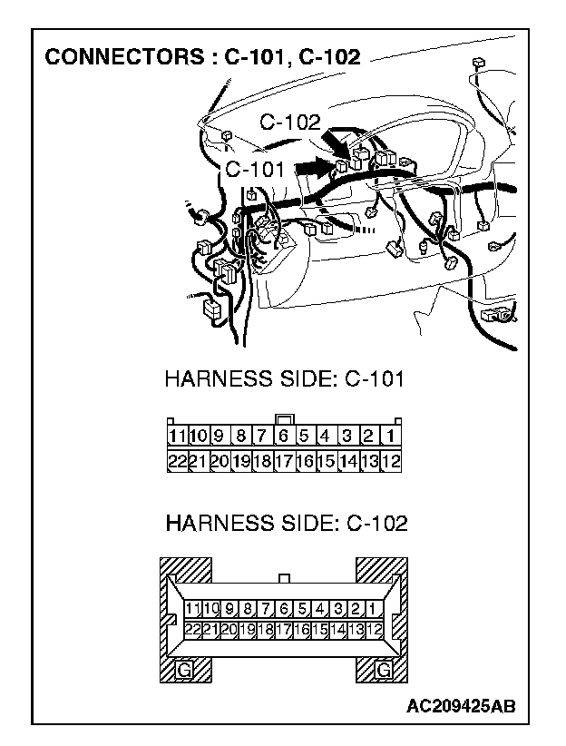STEP 3. Check joint connector (4) C-101 and combination meter connector C-102 for loose, corroded or damaged terminals, or terminals pushed back in the connector.