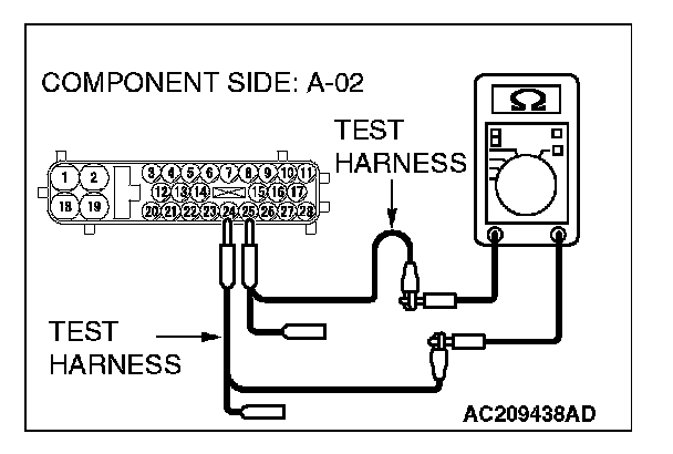 5. Measure the resistance between ABS/TCL-ECU connector terminals 24 and 25.