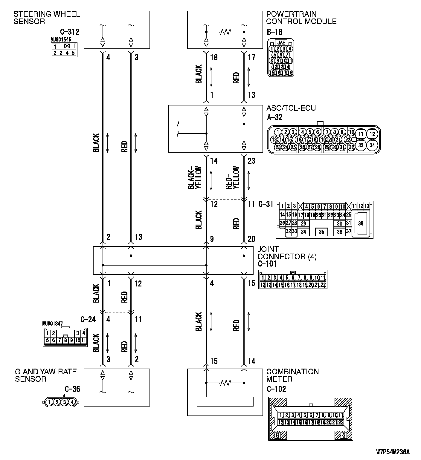 STEP 7. Check powertrain control module connector B-18 and ASC/TCL-ECU connector A-32 for loose, corroded or damaged terminals, or terminals pushed back in the connector.
