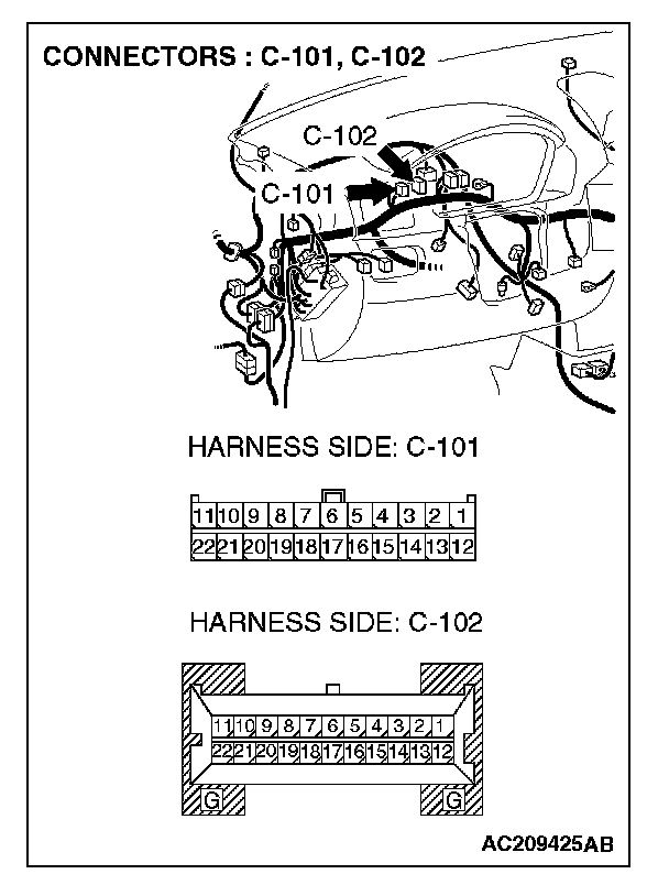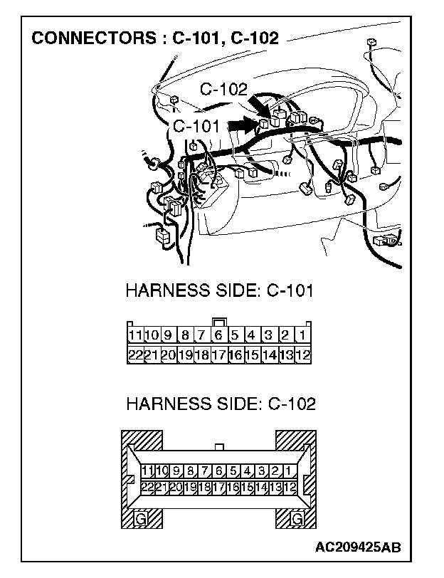 STEP 3. Check joint connector (4) C-101 and combination meter connector C-102 for loose, corroded or damaged terminals, or terminals pushed back in the connector.