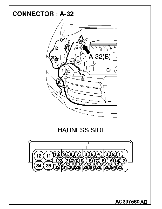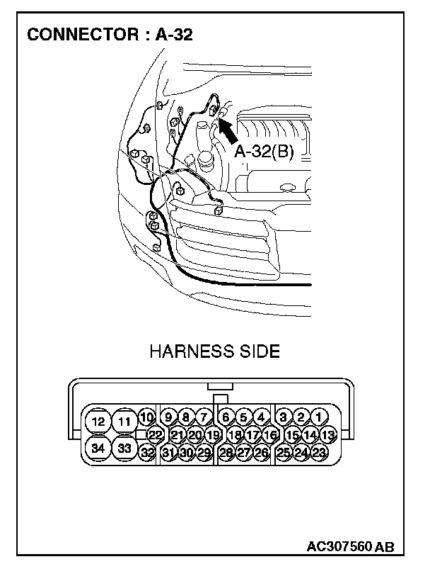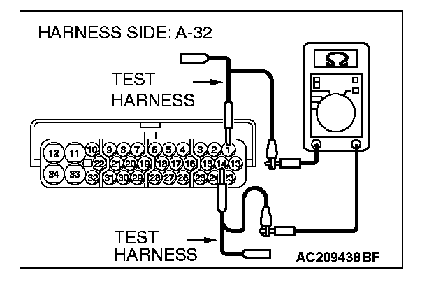1. Disconnect ASC/TCL-ECU connector A-32, and measure the resistance at the wiring harness side of ASC/TCL-ECU connector A-32.