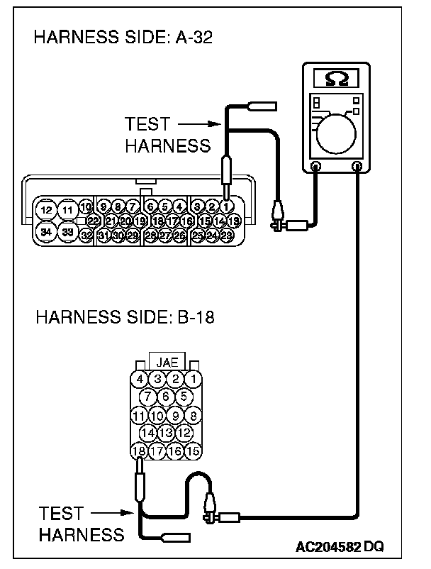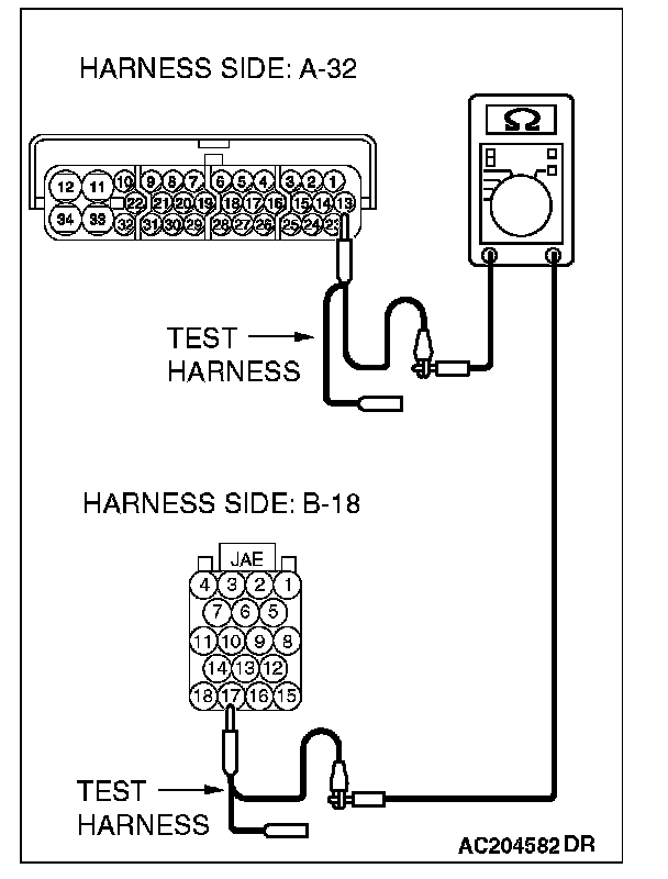 1. Disconnect ASC/TCL-ECU connector A-32 and powertrain control module connector B-18, and measure the resistance between each wiring harness side connector.