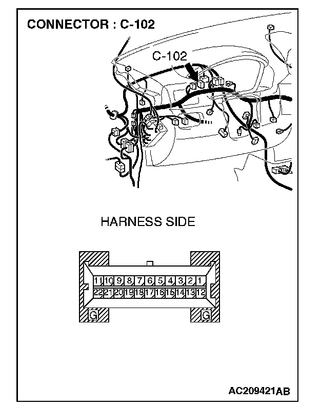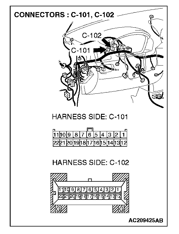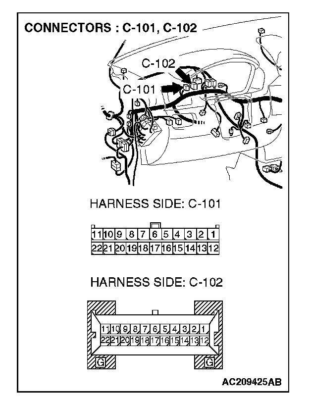 STEP 5. Check joint connector (4) C-101 and combination meter connector C-102 for loose, corroded or damaged terminals, or terminals pushed back in the connector.
