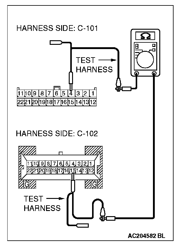 1. Disconnect joint connector (4) C-101 and combination meter connector C-102, and measure the resistance between each wiring harness side connector.