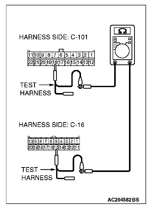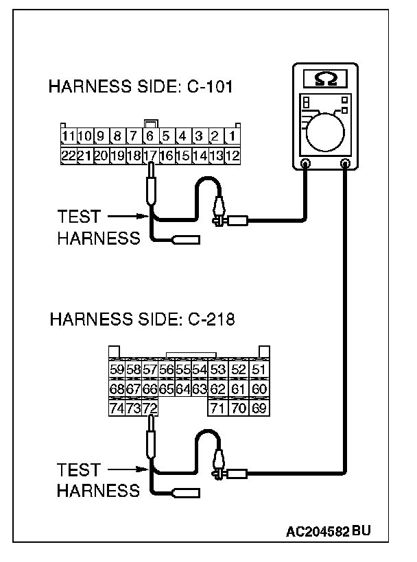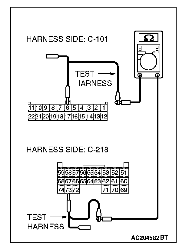 1. Disconnect joint connector (4) C-101 and ETACS-ECU connector C-218, and measure the resistances at the wiring harness sides of joint connector (4) C-101 and ETACS-ECU connector C-218.