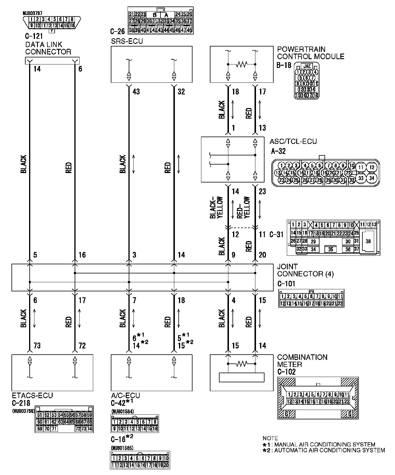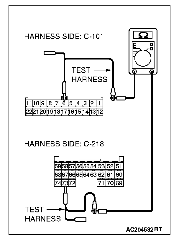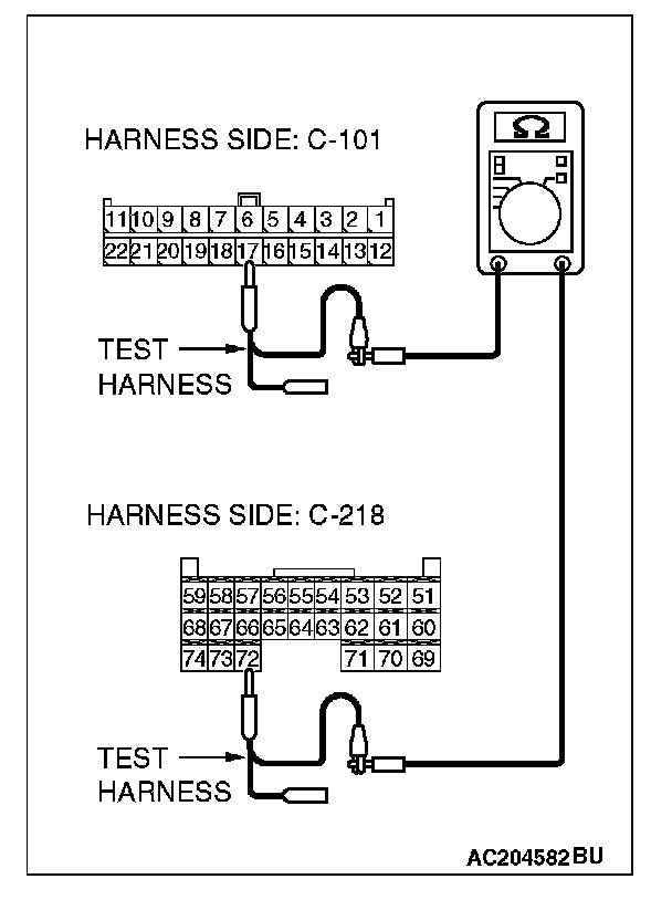 1. Disconnect joint connector (4) C-101 and ETACS-ECU connector C-218, and measure the resistances at the wiring harness sides of joint connector (4) C-101 and ETACS-ECU connector C-218.
