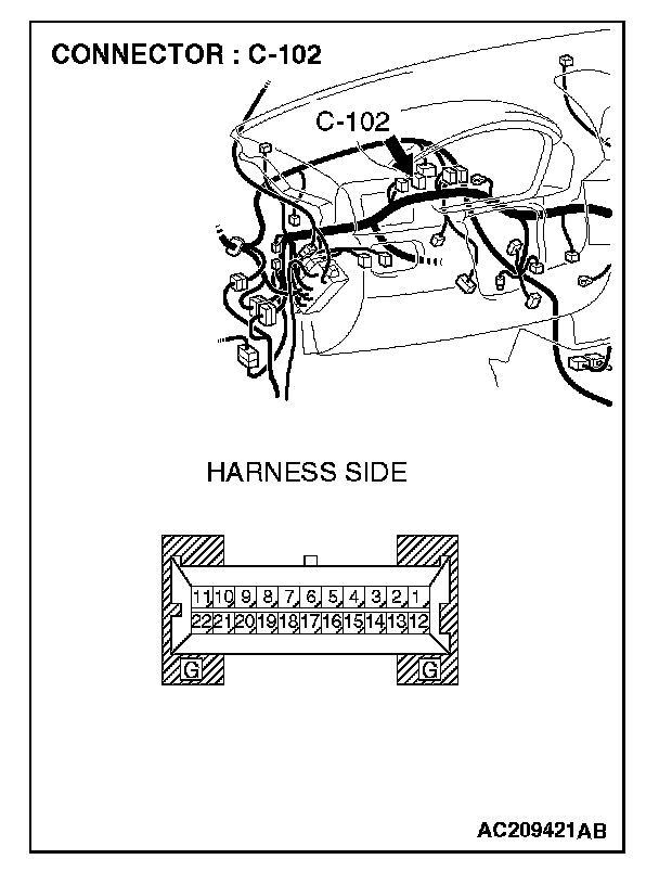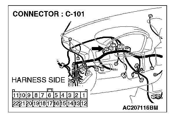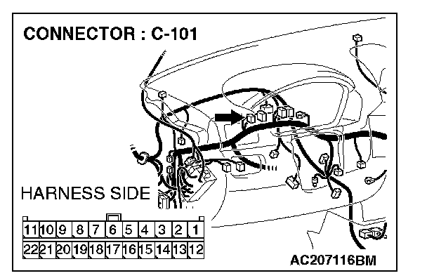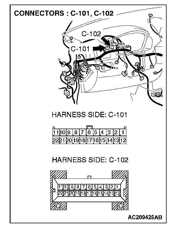 STEP 5. Check joint connector (4) C-101 and combination meter connector C-102 for loose, corroded or damaged terminals, or terminals pushed back in the connector.