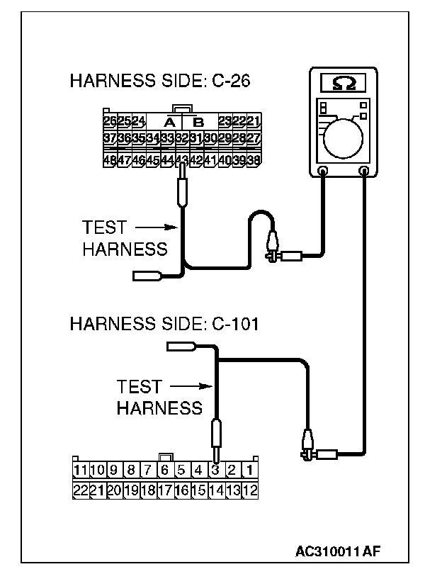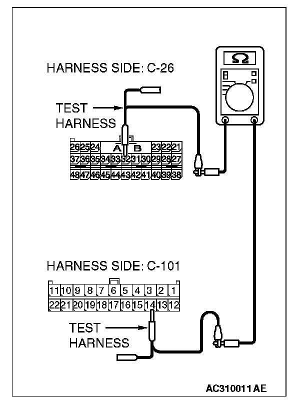 1. Disconnect joint connector (4) C-101 and SRS-ECU connector C-26, and measure the resistances at the wiring harness sides of joint connector (4) C-101 and SRS-ECU connector C-26.