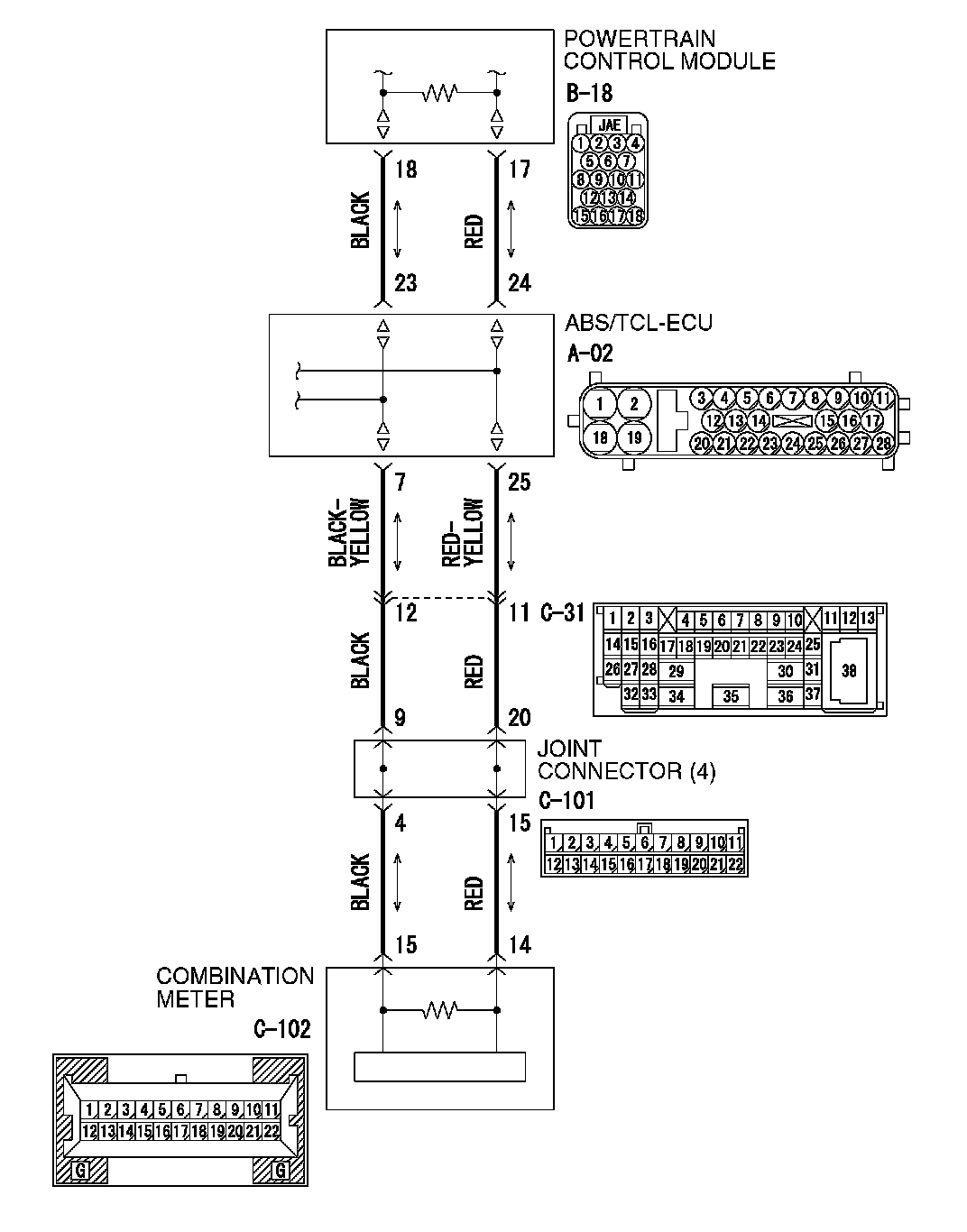 1. Disconnect ABS/TCL-ECU connector A-02 and powertrain control module connector B-18, and measure the resistance between each wiring harness side connector.