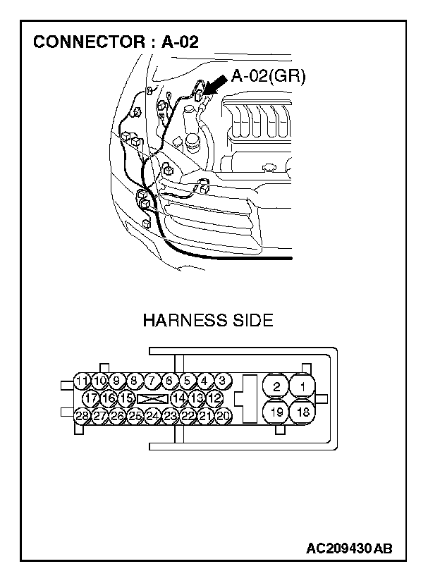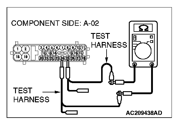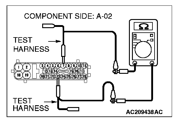 1. Disconnect ABS/TCL-ECU connector A-02, and measure the resistance at the equipment side of ABS/TCL-ECU connector A-02.