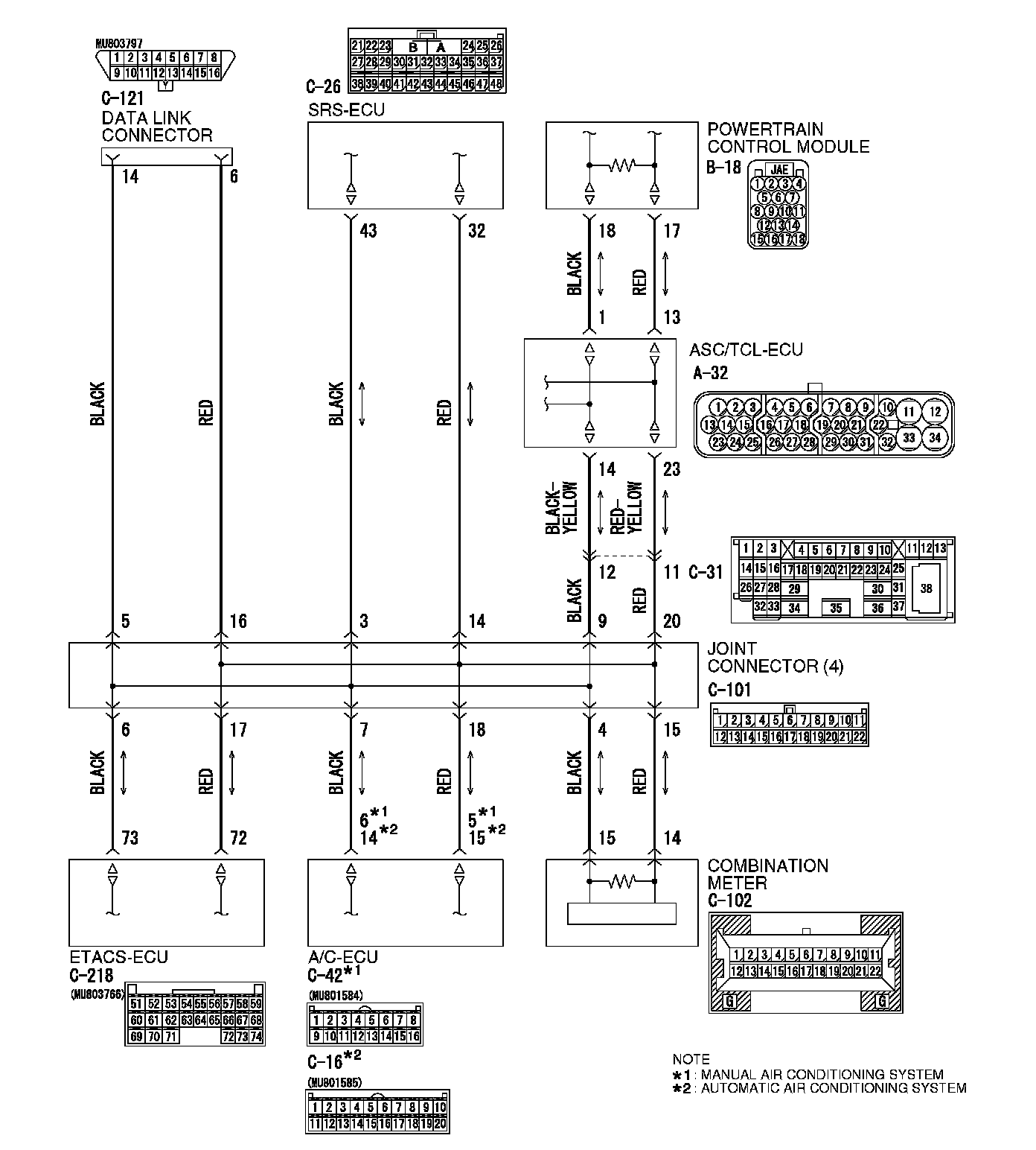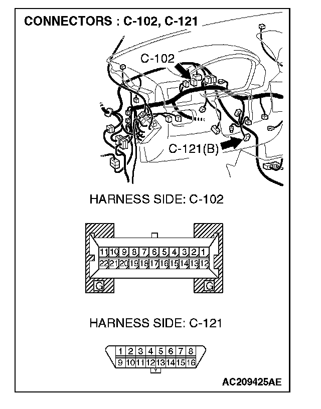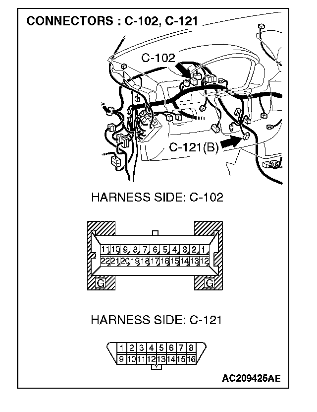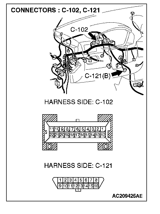 STEP 1. Check powertrain control module connector B-18, combination meter connector C-102 and data link connector C-121 for loose, corroded or damaged terminals, or terminals pushed back in the connector.