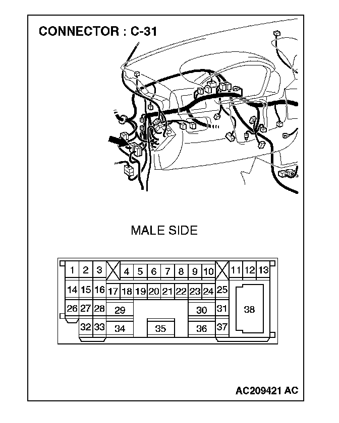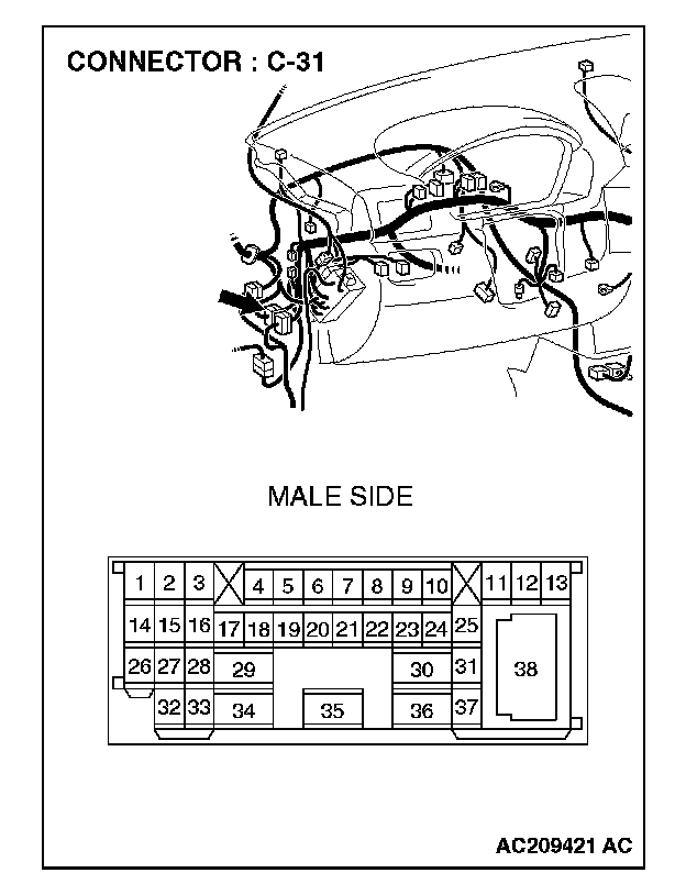 1. Disconnect intermediate connector C-31, and measure the voltage at the male side (at front wiring harness side).
