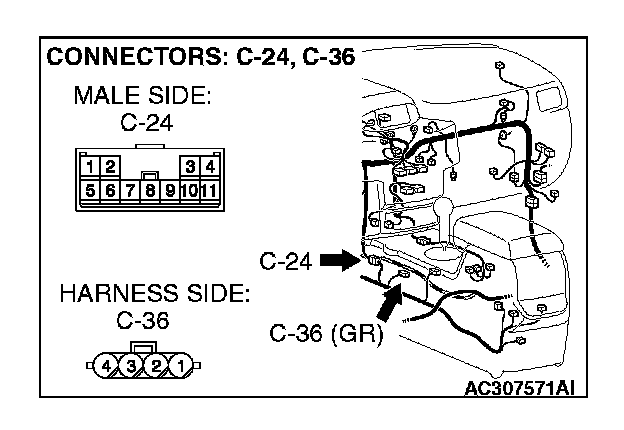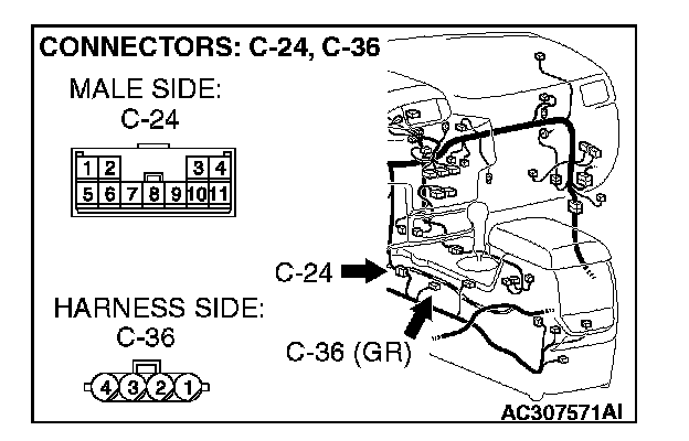 1. Disconnect intermediate connector C-24 and G and yaw rate sensor connector C-36, and measure the voltage at the wiring harness side of intermediate connector male side (at front wiring harness side).