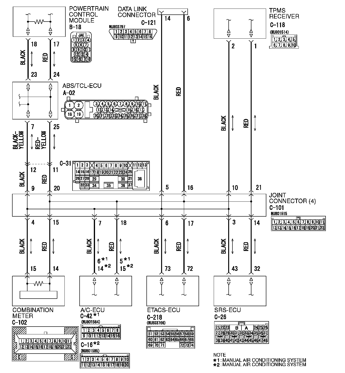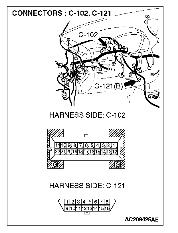 STEP 1. Check powertrain control module connector B-18, combination meter connector C-102 and data link connector C-121 for loose, corroded or damaged terminals, or terminals pushed back in the connector.