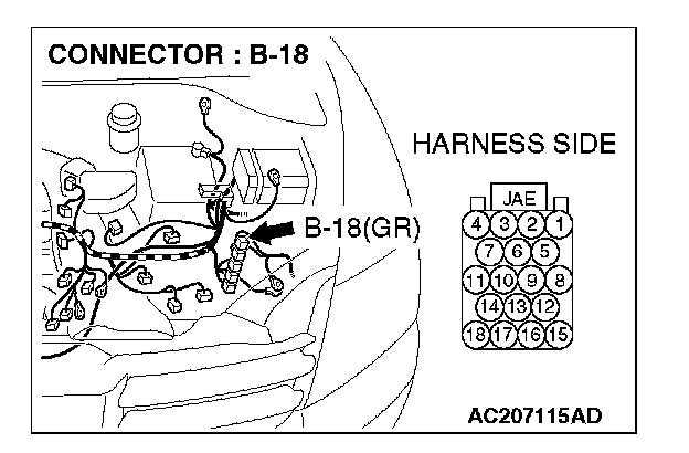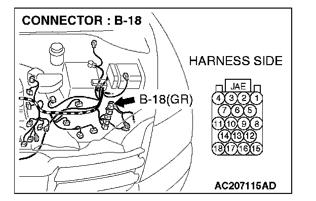 1. Disconnect powertrain control module connector B-18 and ABS/TCL-ECU connector A-02, and measure the resistance at the harness side of powertrain control module connector B-18.