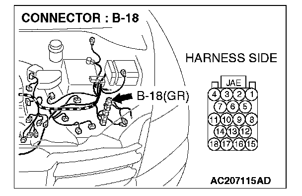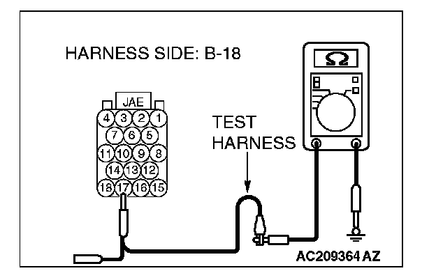 1. Disconnect powertrain control module connector B-18 and ABS/TCL-ECU connector A-02, and measure the resistance at the harness side of powertrain control module connector B-18.