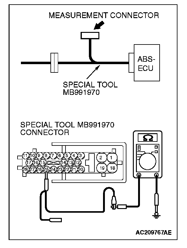 5. Measure the resistance between special tool MB991970 (ABS check harness) connector terminal 25 and body ground.