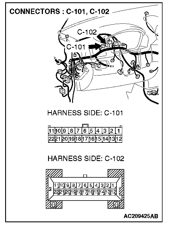 1. Disconnect joint connector (4) C-101 and combination meter connector C-102, and measure the resistance at the wiring harness side of joint connector (4) C-101.