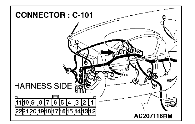 1. Disconnect joint connector (4) C-101 and multi-center display unit (middle-grade type or vehicles with Mitsubishi multi communication system) connector C-06