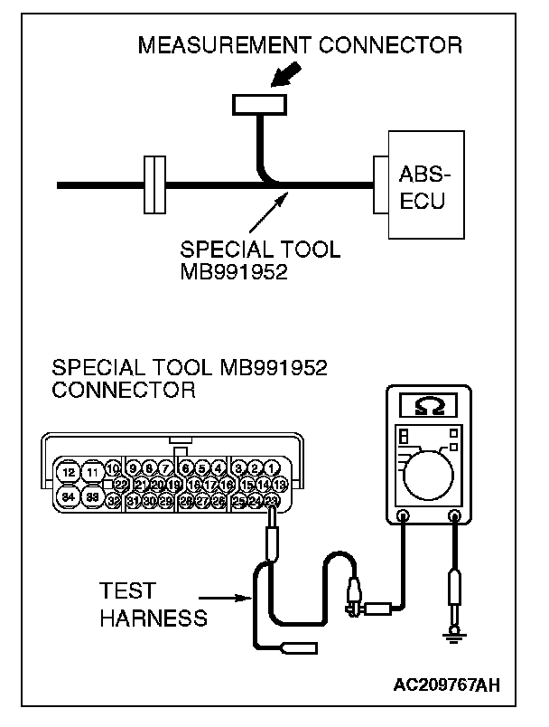 5. Measure the resistance between special tool MB991952 (ABS check harness) connector terminal 23 and body ground.