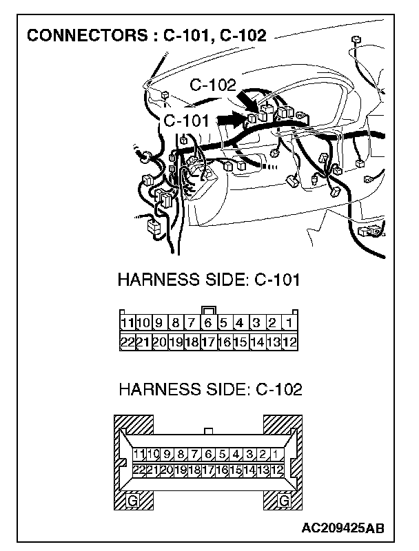 1. Disconnect joint connector (4) C-101 and combination meter connector C-102, and measure the resistance at the wiring harness side of joint connector (4) C-101.