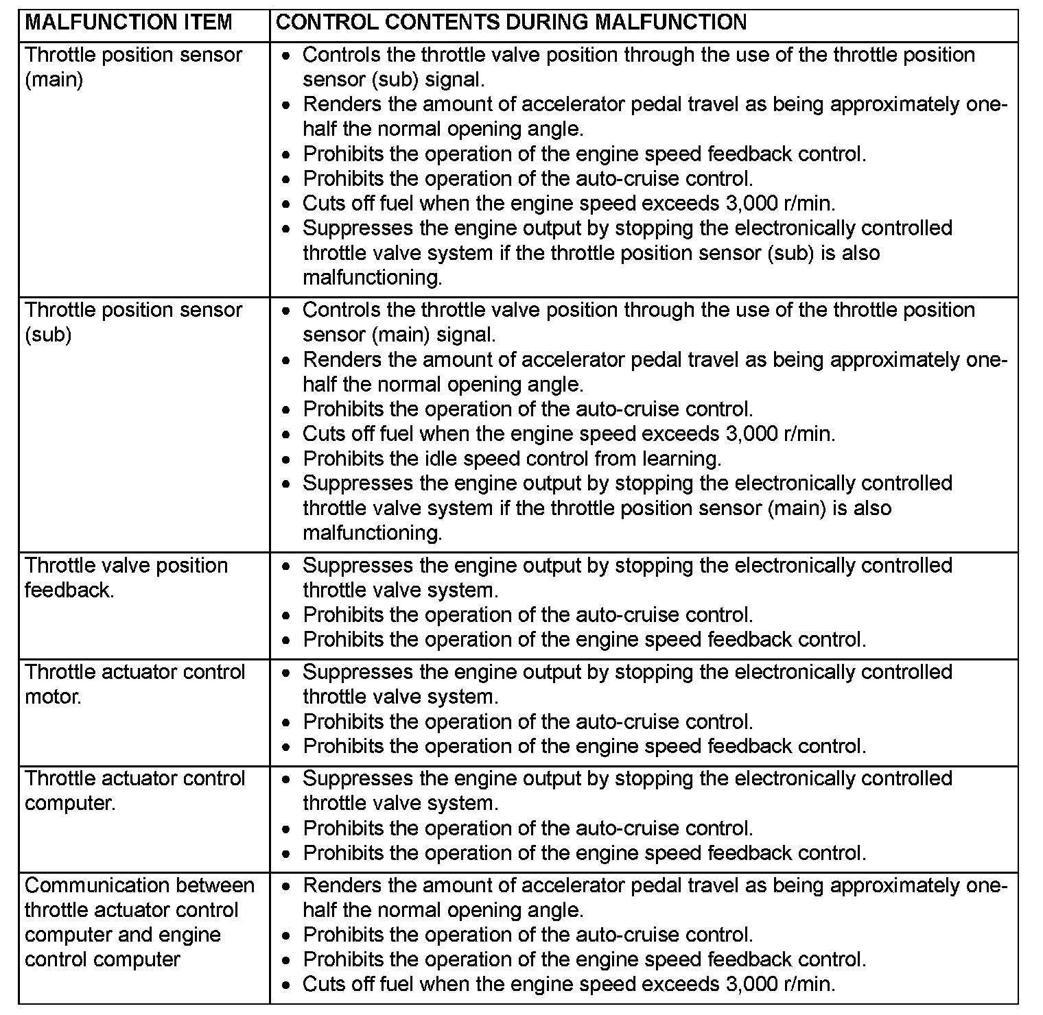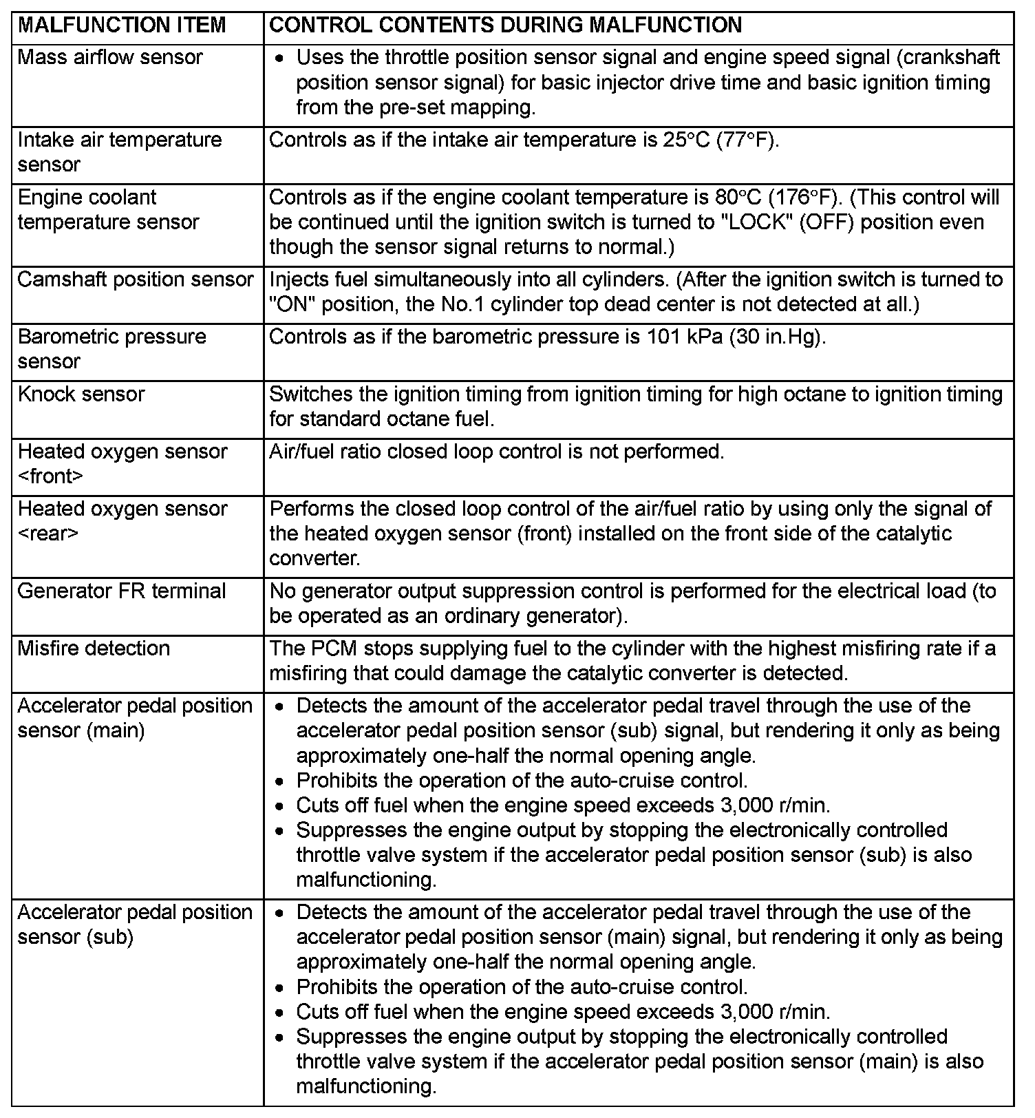 When the main sensor malfunctions are detected by the diagnostic test mode, the vehicle is controlled by means of the following defaults.