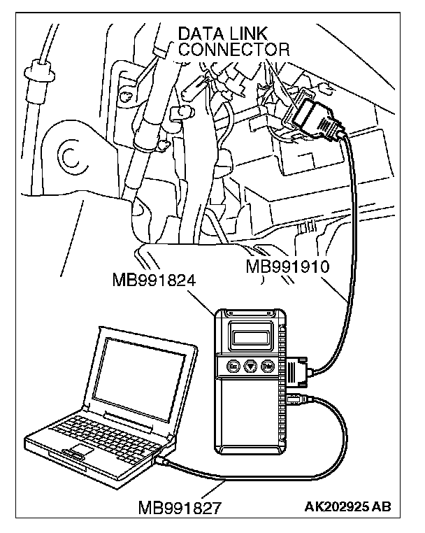 CAUTION: To prevent damage to scan tool MB991958, always turn the ignition switch to the "LOCK" (OFF) position before connecting or disconnecting scan tool MB991958.