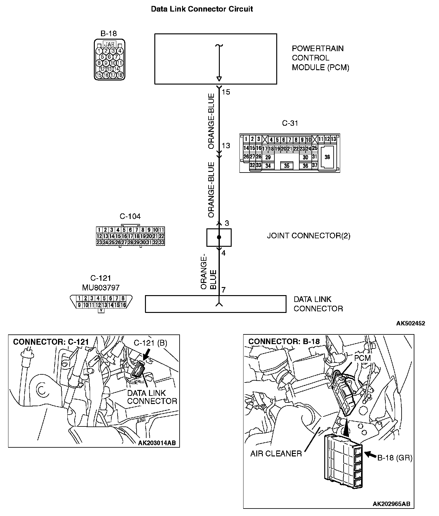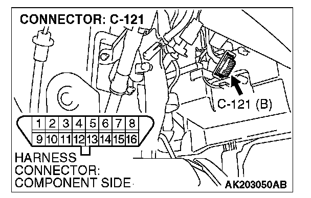 STEP 2. Check for open circuit, short circuit to ground and harness damage between data link connector C-121 (terminal No. 7) and PCM connector B-18 (terminal No. 15).