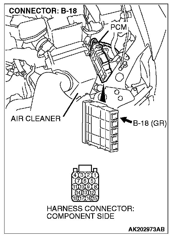 STEP 1. Check harness connector B-18 at PCM for damage.